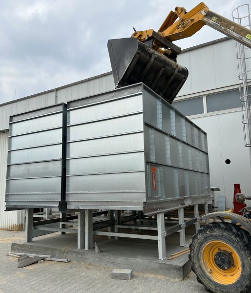 Konštrukcia je vyrobená z modulárnych viacnásobne ohýbaných prvkov z hrubého pozinkovaného plechu, ktoré sú montované „na presah“ - Tvoria veľmi pevný korpus a v prípade opotrebovania sú ľahko vymeniteľné,<br><br>Zásobníky sú vybavené vyhrňovacím systémom poháňaným hydraulickým valcom,<br>Odber suroviny je zabezpečený priečnym šnekom,<br><br>Voliteľne:<br>*Diskový triedič,<br>*nakladací šnek,<br>*prijímací dok,<br>*šneky alebo súprava šnekov na rozhrňovanie suroviny,