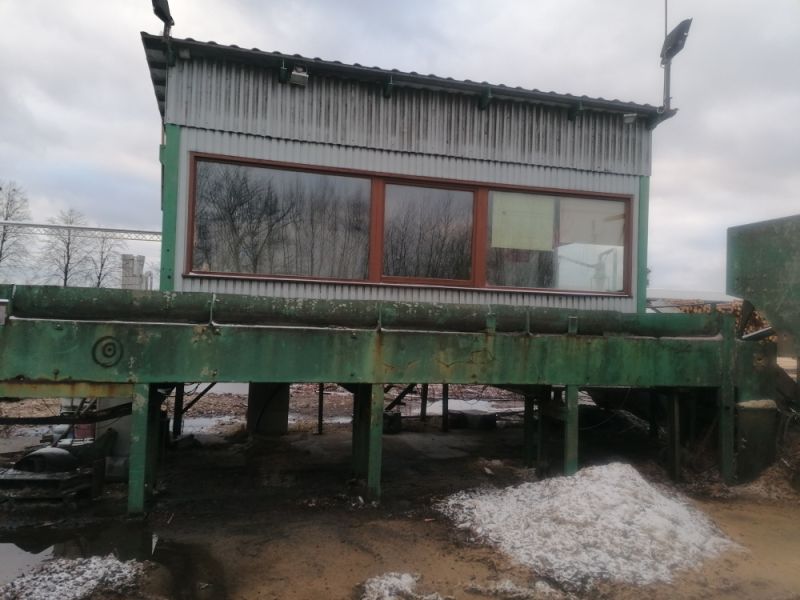 Stacja do cięcia z piłą tarczową oraz stoperami hydraulicznymi wyznaczającymi długość cięcia oraz redlerem odprowadzającym odpady powstałe podczas cięcia.